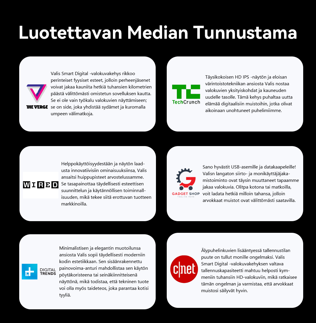 Tuloksena syntyi Valis Smart Photo Frame – älykehys, joka tehokkaan Wi-Fi-yhteyden ja yksinkertaisen muotoilunsa ansiosta tekee jakamisesta vaivatonta ja esittää jokaisen hetken kirkkaana HD-laatuna. Valisin missio on selvä: muuttaa digitaalinen kaaos jakamisen iloksi, jotta voit keskittyä muistoihin teknologian sijaan.