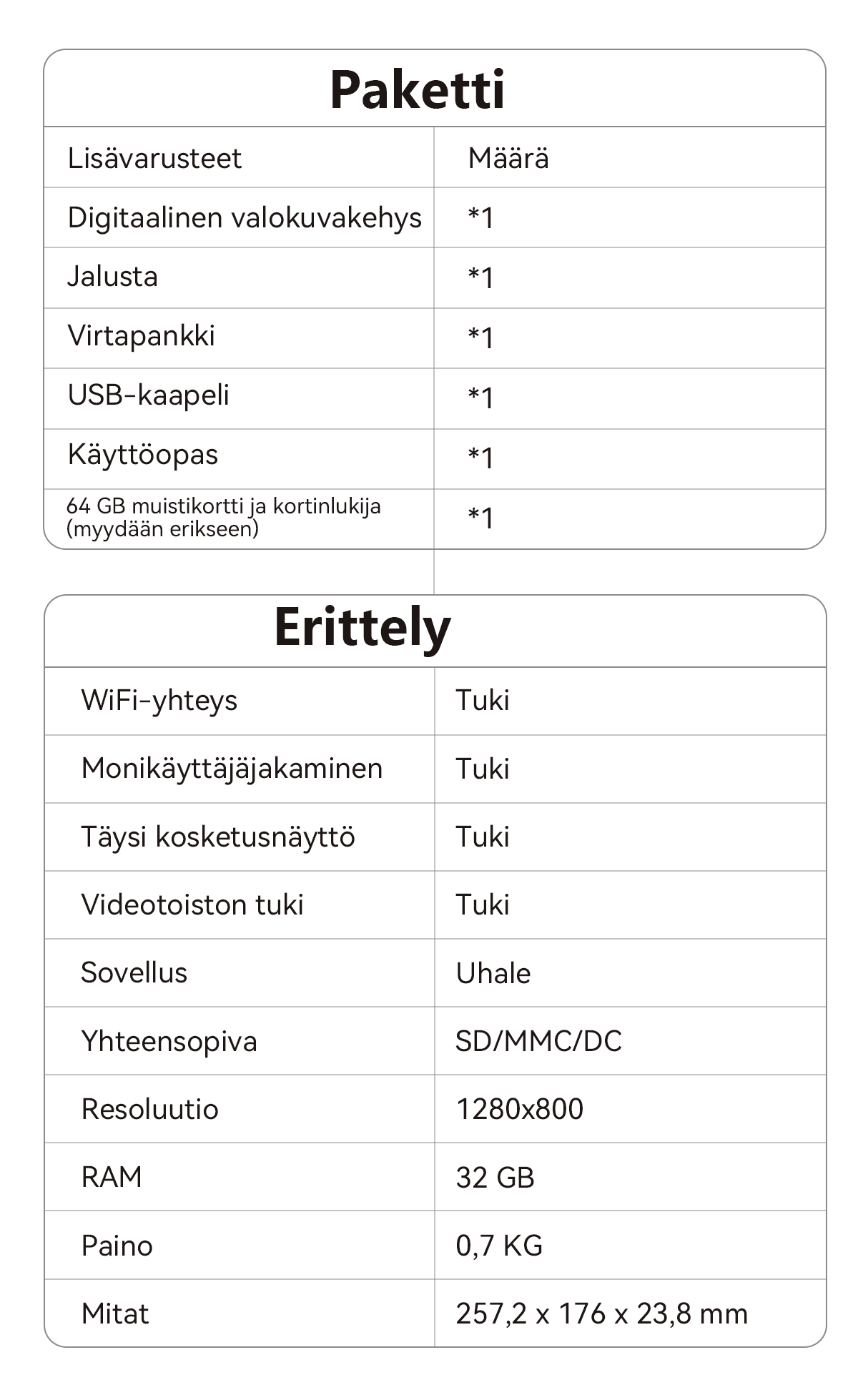 - Kattava audiovisuaalinen kokemus: Tukee useita kuva- ja videoformaatteja. Sisäänrakennetut laadukkaat kaiuttimet tarjoavat mukaansatempaavan elämyksen.